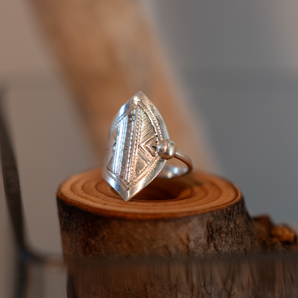 투아레그 장인이 쏘(타가네)로 하나하나 직접 조각해 완성한 실버 링입니다.