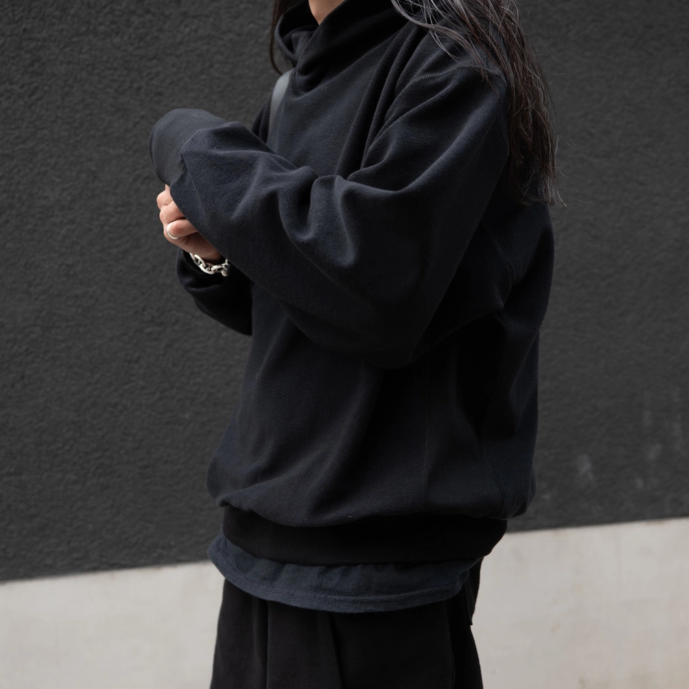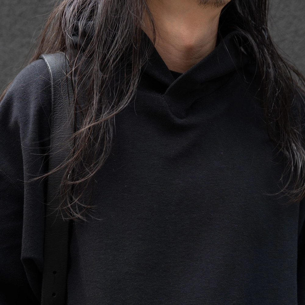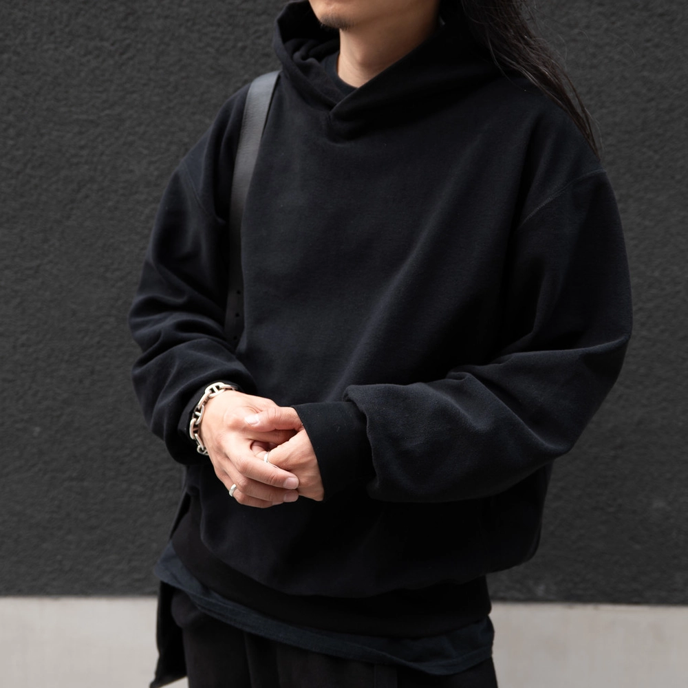 스웨이드와 같은 부드럽고 고급스러운 표면감을 구현하고 있는 여유로운 실루엣의 후드 입니다.