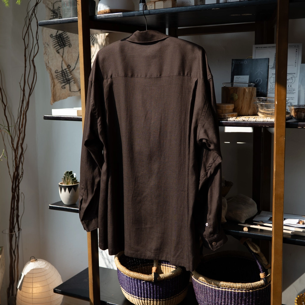 소재는 시즈오카현 엔슈 지역에서 직조부터 가공까지 진행된 원단으로, 경사와 위사 모두 20수 단사를 사용한 레이온과 린넨 혼방의 평직입니다.