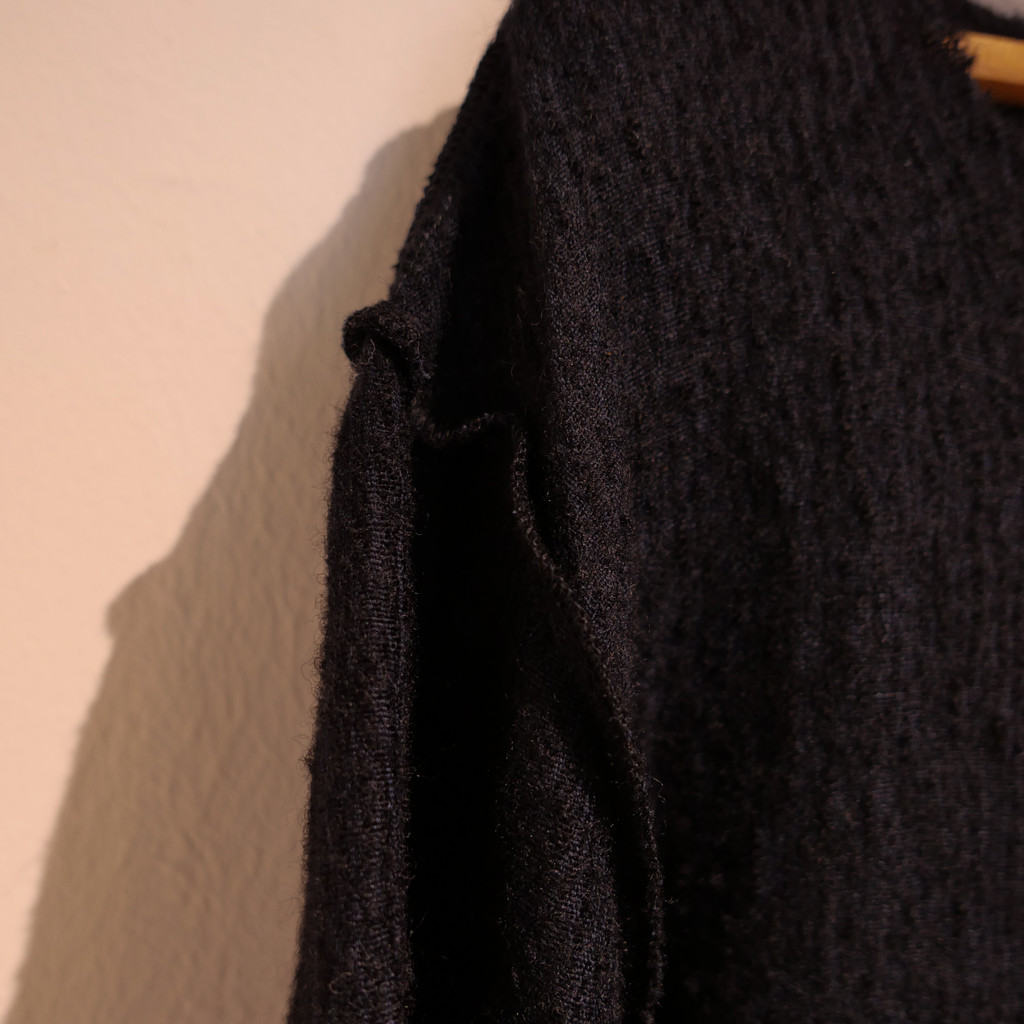세로실에 리넨, 가로실에 울을 사용한 거칠고 질감 있는 원단으로 만든 풀오버 셔츠입니다.